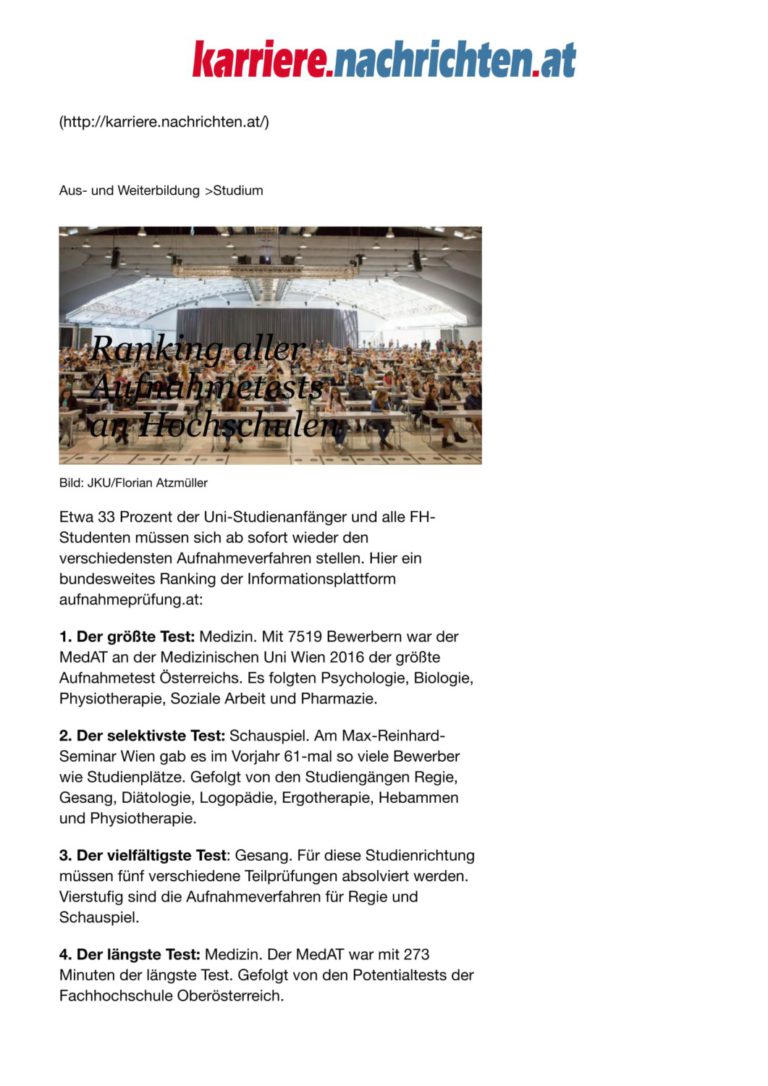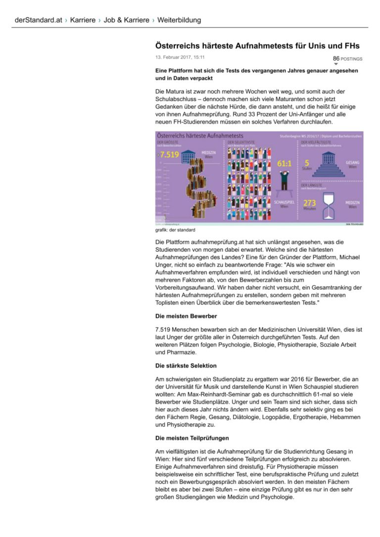 „Österreichs härteste Aufnahmetests für Unis und FHs“ (Der Standard, 13.02.2017)